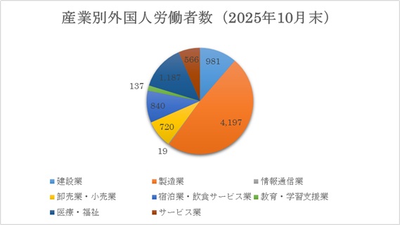 の産業別では、製造業、医療・福祉、建設業などで多くの外国人労働者を雇用しています。