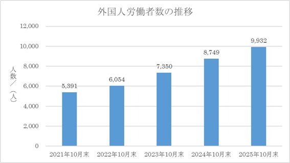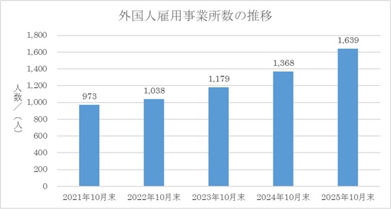を続けており、県内で外国人材を受け入れる企業がさらに広がっていることが分かります。